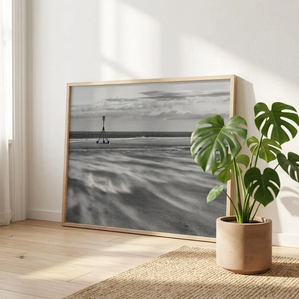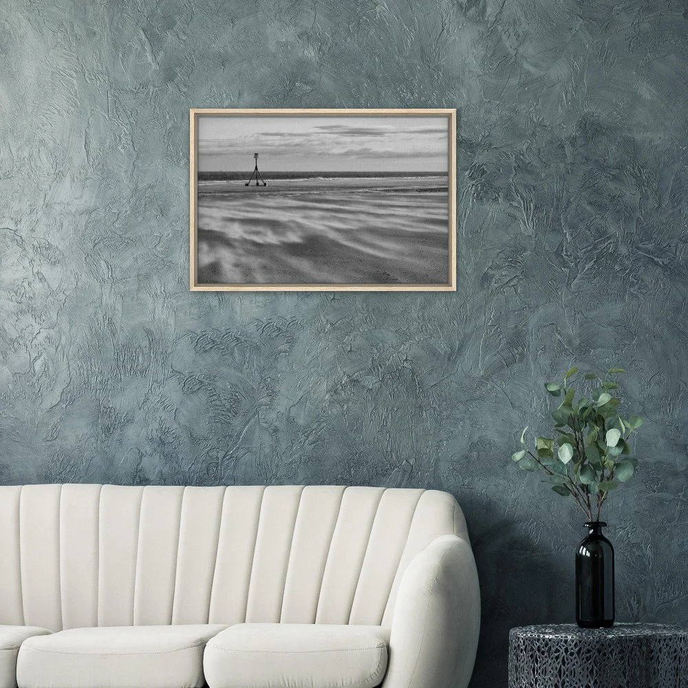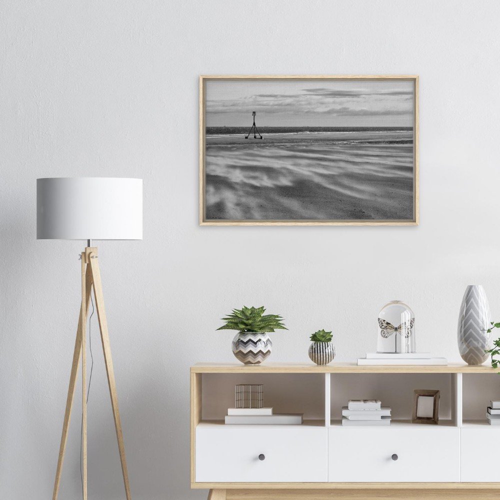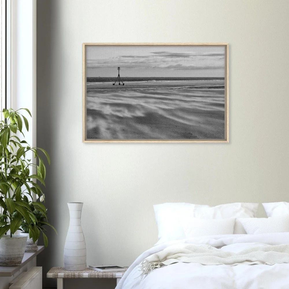 Bring the dramatic beauty of Redcar Beach into your home with this stunning black and white framed canvas print. Capturing the windswept atmosphere and iconic tidal marker, this artwork adds depth and character to any room.